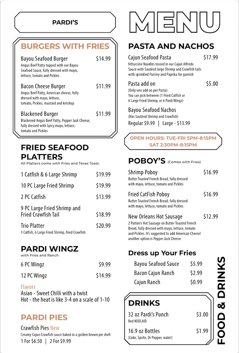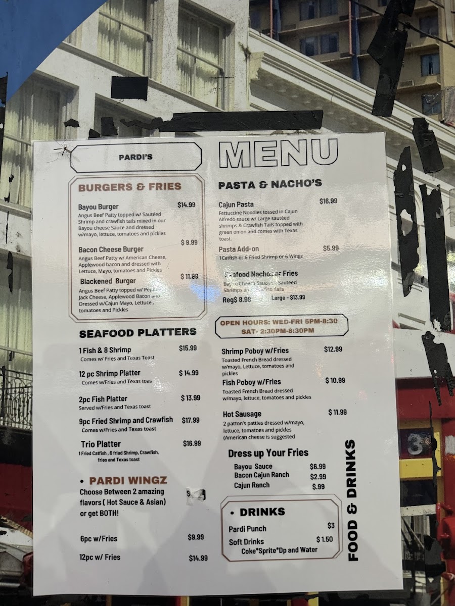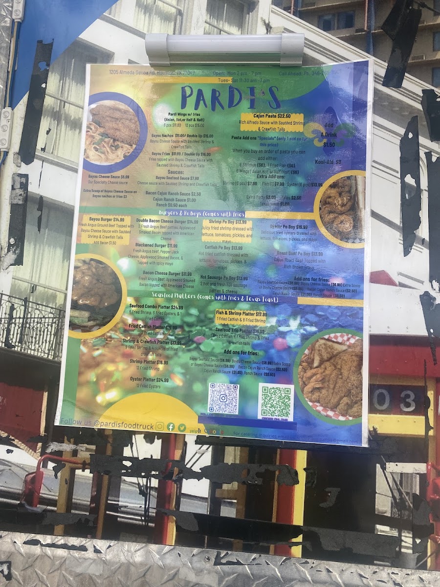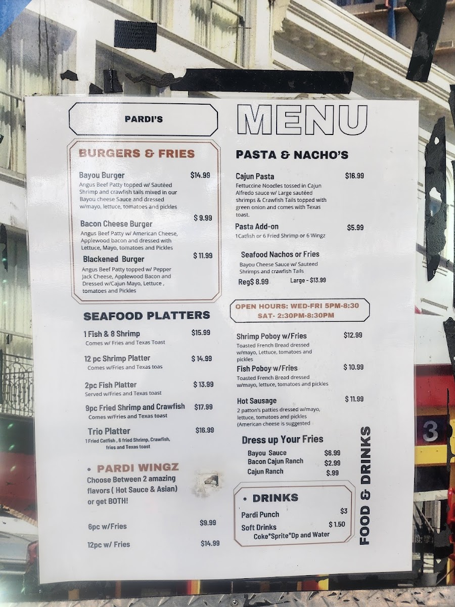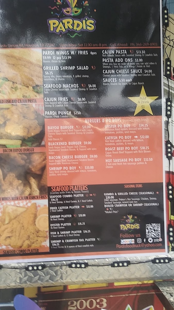 Pardis (Food Truck) offers a bold taste of Cajun cuisine right in Houston. Their menu shines with the Cajun Seafood Pasta, featuring fettuccine in a rich Cajun Alfredo sauce, loaded with sautéed shrimp and crawfish tails, perfectly seasoned with parsley and paprika. You can elevate this dish by adding crispy fried catfish, extra shrimp, or their signature Pardi Wingz. Speaking of wings, the Pardi Wingz come in 6 or 12 pieces, served with fries and ranch, available in unique Asian Sweet Chili or a moderate heat hot sauce that lingers just right. Seafood lovers will also enjoy the Bayou Seafood Nachos, topped generously with shrimp and crawfish. Don’t miss dressing up your fries with their savory Bayou Seafood Sauce or smoky Bacon Cajun Ranch for added depth. The dishes strike a balance between hearty, fresh, and soulfully spiced, reminiscent of home-cooked Southern comfort, making Pardis a must-visit on wheels for authentic Cajun flavors.